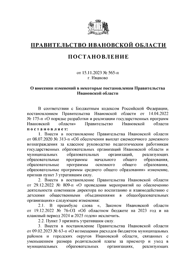 Постановление Правительства Ивановской области от 15.11.2023 N 565-п "О внесении изменений в некоторые постановления Правительства Ивановской области"