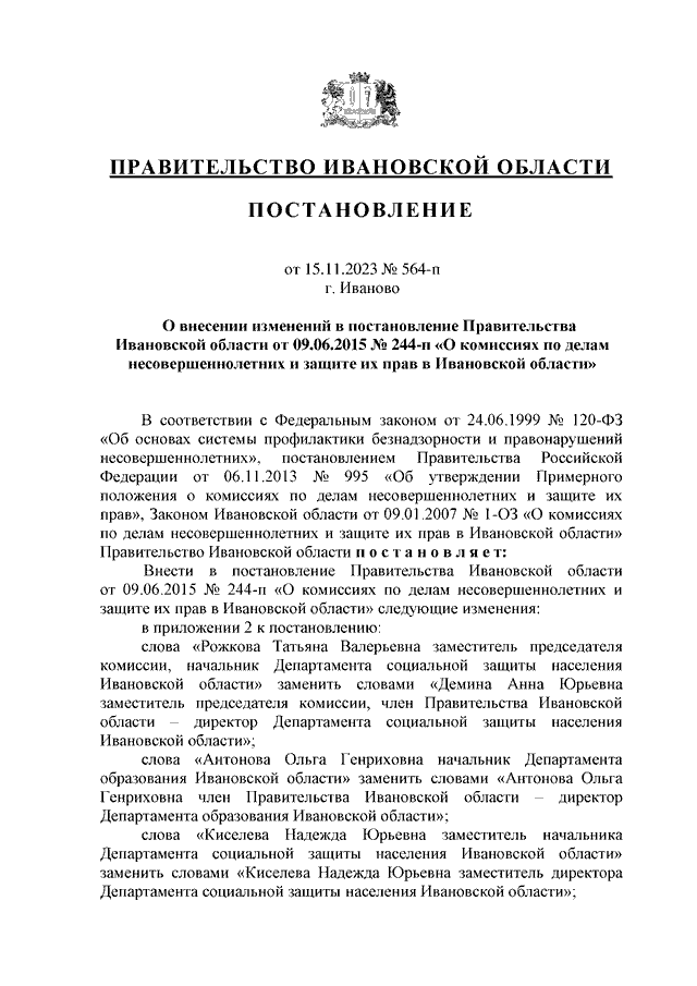 Постановление Правительства Ивановской области от 15.11.2023 N 564-п "О внесении изменений в постановление Правительства Ивановской области от 09.06.2015 N 244-п "О комиссиях по делам несовершеннолетних и защите их прав в Ивановской области"