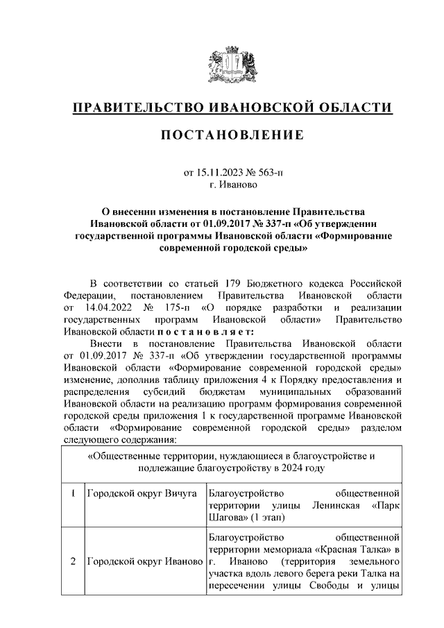 Постановление Правительства Ивановской области от 15.11.2023 N 563-п "О внесении изменения в постановление Правительства Ивановской области от 01.09.2017 N 337-п "Об утверждении государственной программы Ивановской области "Формирование современной городской среды"