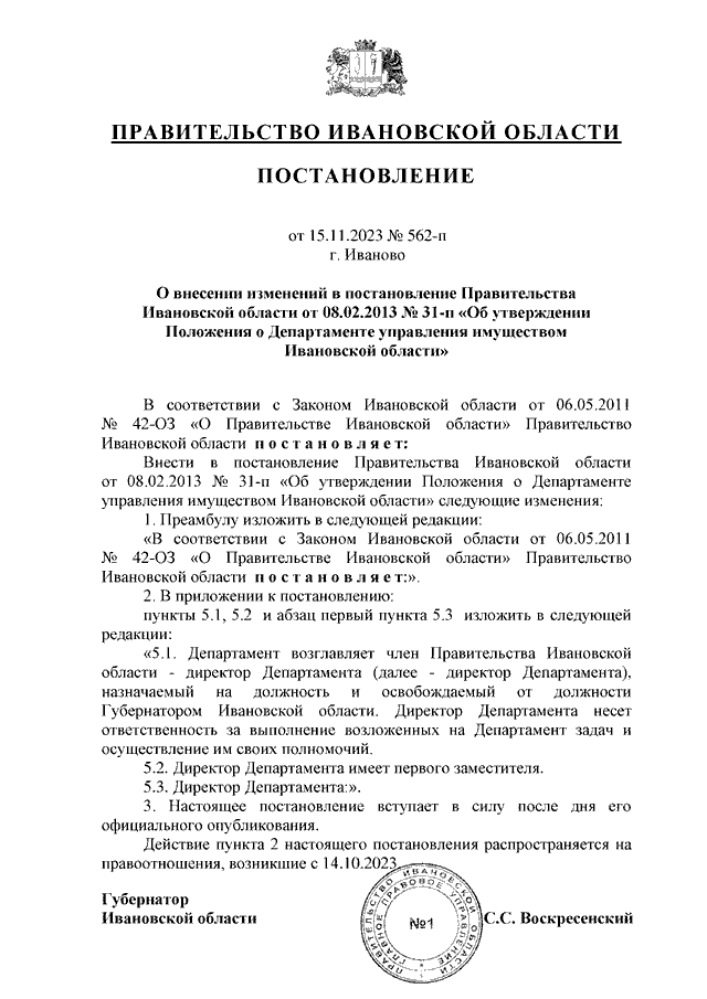 Постановление Правительства Ивановской области от 15.11.2023 N 562-п "О внесении изменений в постановление Правительства Ивановской области от 08.02.2013 N 31-п "Об утверждении Положения о Департаменте управления имуществом Ивановской области"