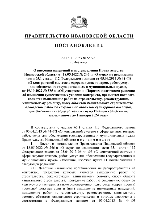 Постановление Правительства Ивановской области от 15.11.2023 N 555-п "О внесении изменений в постановления Правительства Ивановской области от 18.05.2022 N 246-п "О мерах по реализации части 65.1 статьи 112 Федерального закона от 05.04.2013 N 44-ФЗ "О контрактной системе в сфере закупок товаров, работ, услуг для обеспечения государственных и муниципальных нужд", от 19.10.2022 N 585-п "Об утверждении Порядка подготовки решения об изменении существенных условий контракта, предметом которого является выполнение работ по строительству, реконструкции, капитальному ремонту, сносу объектов капитального строительства, проведение работ по сохранению объектов культурного наследия, для обеспечения государственных нужд Ивановской области, заключенного до 1 января 2024 года"
