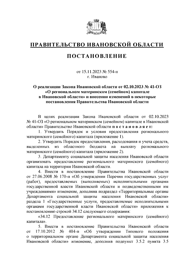 Постановление Правительства Ивановской области от 15.11.2023 N 554-п "О реализации Закона Ивановской области от 02.10.2023 N 41-ОЗ "О региональном материнском (семейном) капитале в Ивановской области" и внесении изменений в некоторые постановления Правительства Ивановской области" (вместе с "Порядком и условиями предоставления регионального материнского (семейного) капитала", "Порядком предоставления, расходования и учета средств, поступающих из областного бюджета на осуществление регионального материнского (семейного) капитала")