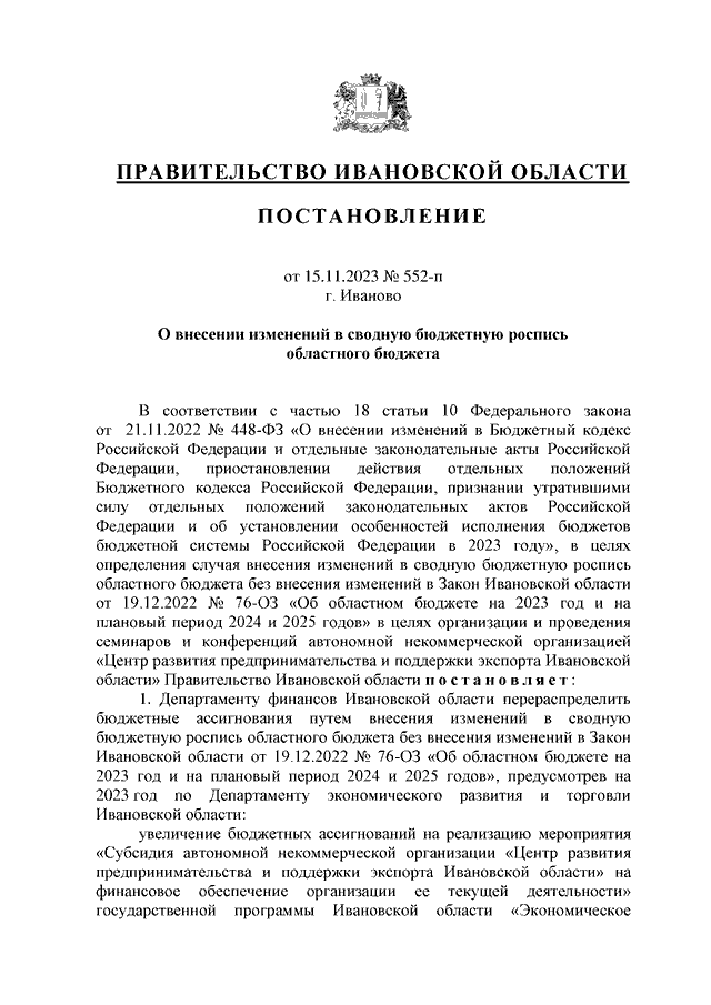 Постановление Правительства Ивановской области от 15.11.2023 N 552-п "О внесении изменений в сводную бюджетную роспись областного бюджета"