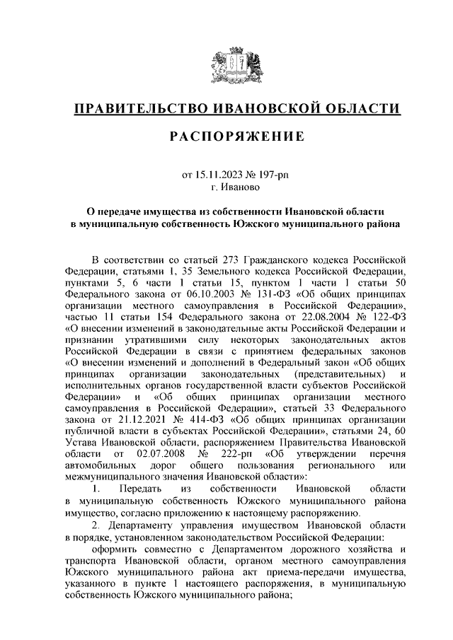 Распоряжение Правительства Ивановской области от 15.11.2023 N 197-рп "О передаче имущества из собственности Ивановской области в муниципальную собственность Южского муниципального района"