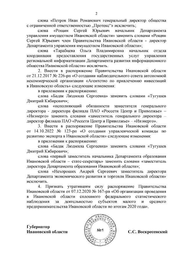 Распоряжение Правительства Ивановской области от 15.11.2023 N 194-рп "О внесении изменений в некоторые распоряжения Правительства Ивановской области и признании утратившим силу распоряжения Правительства Ивановской области от 07.12.2020 N 167-рп "Об организации проведения в Ивановской области сплошного федерального статистического наблюдения за деятельностью субъектов малого и среднего предпринимательства Ивановской области по итогам 2020 года"