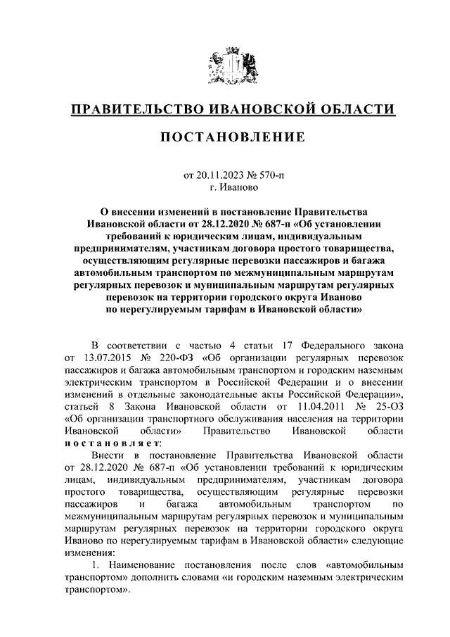 Постановление Правительства Ивановской области от 20.11.2023 N 570-п "О внесении изменений в постановление Правительства Ивановской области от 28.12.2020 N 687-п "Об установлении требований к юридическим лицам, индивидуальным предпринимателям, участникам договора простого товарищества, осуществляющим регулярные перевозки пассажиров и багажа автомобильным транспортом по межмуниципальным маршрутам регулярных перевозок и муниципальным маршрутам регулярных перевозок на территории городского округа Иваново по нерегулируемым тарифам в Ивановской области"