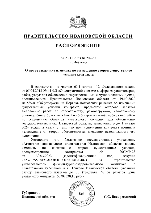 Распоряжение Правительства Ивановской области от 23.11.2023 N 202-рп "О праве заказчика изменить по соглашению сторон существенное условие контракта"