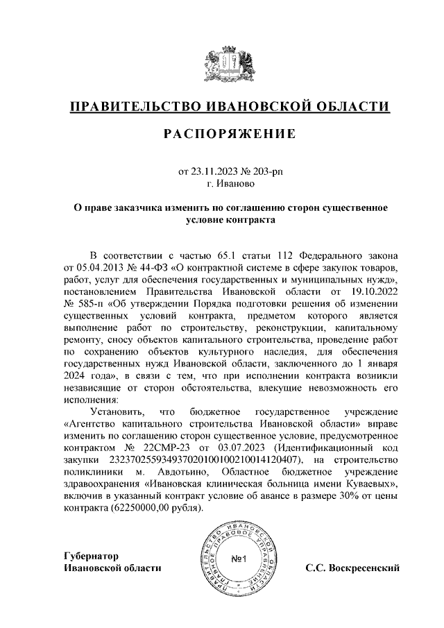 Распоряжение Правительства Ивановской области от 23.11.2023 N 203-рп "О праве заказчика изменить по соглашению сторон существенное условие контракта"