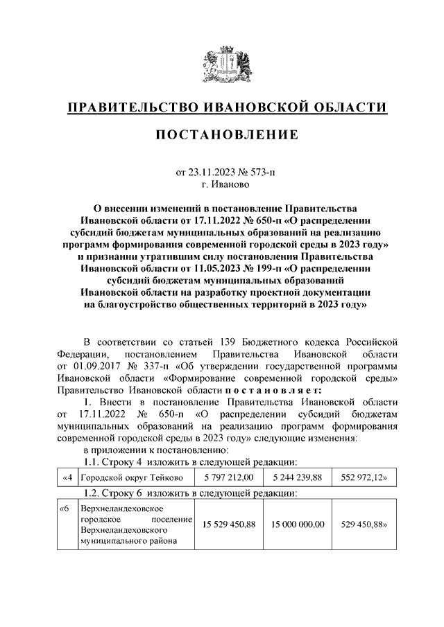 Постановление Правительства Ивановской области от 23.11.2023 N 573-п "О внесении изменений в постановление Правительства Ивановской области от 17.11.2022 N 650-п "О распределении субсидий бюджетам муниципальных образований на реализацию программ формирования современной городской среды в 2023 году" и признании утратившим силу постановления Правительства Ивановской области от 11.05.2023 N 199-п "О распределении субсидий бюджетам муниципальных образований Ивановской области на разработку проектной документации на благоустройство общественных территорий в 2023 году"