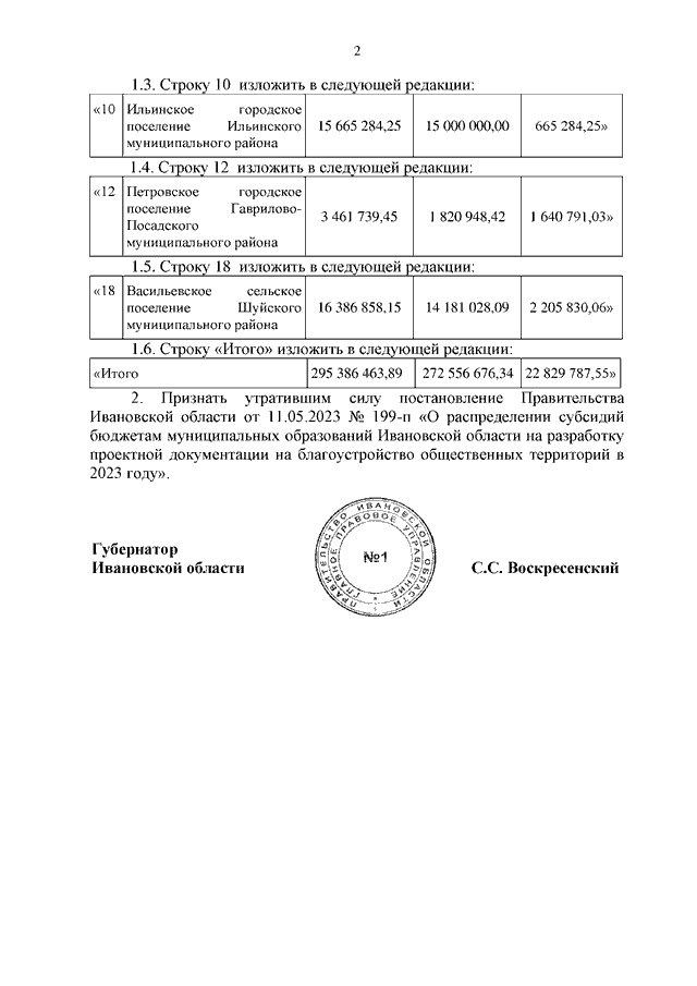 Постановление Правительства Ивановской области от 23.11.2023 N 573-п "О внесении изменений в постановление Правительства Ивановской области от 17.11.2022 N 650-п "О распределении субсидий бюджетам муниципальных образований на реализацию программ формирования современной городской среды в 2023 году" и признании утратившим силу постановления Правительства Ивановской области от 11.05.2023 N 199-п "О распределении субсидий бюджетам муниципальных образований Ивановской области на разработку проектной документации на благоустройство общественных территорий в 2023 году"