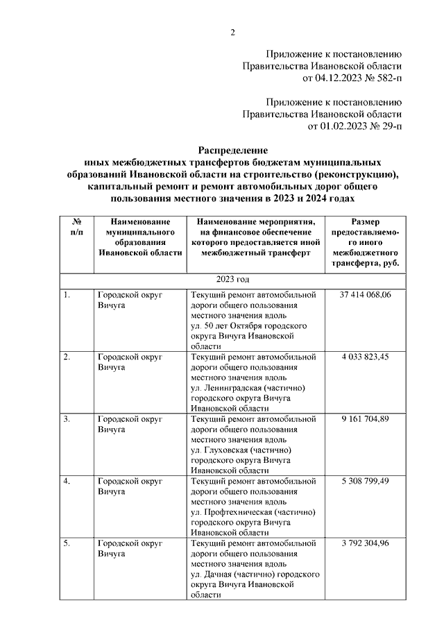 Постановление Правительства Ивановской области от 04.12.2023 N 582-п "О внесении изменения в постановление Правительства Ивановской области от 01.02.2023 N 29-п "О распределении иных межбюджетных трансфертов бюджетам муниципальных образований Ивановской области на строительство (реконструкцию), капитальный ремонт и ремонт автомобильных дорог общего пользования местного значения в 2023 и 2024 годах"