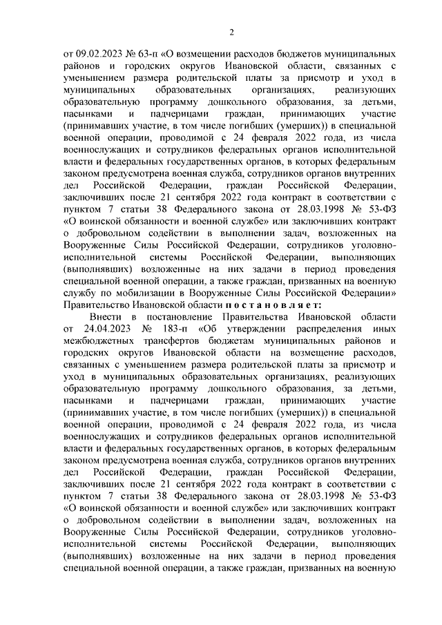 Постановление Правительства Ивановской области от 04.12.2023 N 577-п "О внесении изменения в постановление Правительства Ивановской области от 24.04.2023 N 183-п "Об утверждении распределения иных межбюджетных трансфертов бюджетам муниципальных районов и городских округов Ивановской области на возмещение расходов, связанных с уменьшением размера родительской платы за присмотр и уход в муниципальных образовательных организациях, реализующих образовательную программу дошкольного образования, за детьми, пасынками и падчерицами граждан, принимающих участие (принимавших участие, в том числе погибших (умерших)) в специальной военной операции, проводимой с 24 февраля 2022 года, из числа военнослужащих и сотрудников федеральных органов исполнительной власти и федеральных государственных органов, в которых федеральным законом предусмотрена военная служба, сотрудников органов внутренних дел Российской Федерации, граждан Российской Федерации, заключивших после 21 сентября 2022 года контракт в соответствии с пунктом 7 статьи 38 Федерального закона от 28.03.1998 N 53-ФЗ "О воинской обязанности и военной службе" или заключивших контракт о добровольном содействии в выполнении задач, возложенных на Вооруженные Силы Российской Федерации, сотрудников уголовно-исполнительной системы Российской Федерации, выполняющих (выполнявших) возложенные на них задачи в период проведения специальной военной операции, а также граждан, призванных на военную службу по мобилизации в Вооруженные Силы Российской Федерации, на 2023 - 2025 годы"