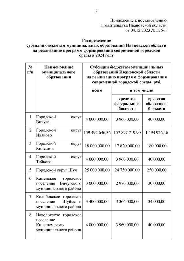 Постановление Правительства Ивановской области от 04.12.2023 N 576-п "О распределении субсидий бюджетам муниципальных образований Ивановской области на реализацию программ формирования современной городской среды в 2024 году"
