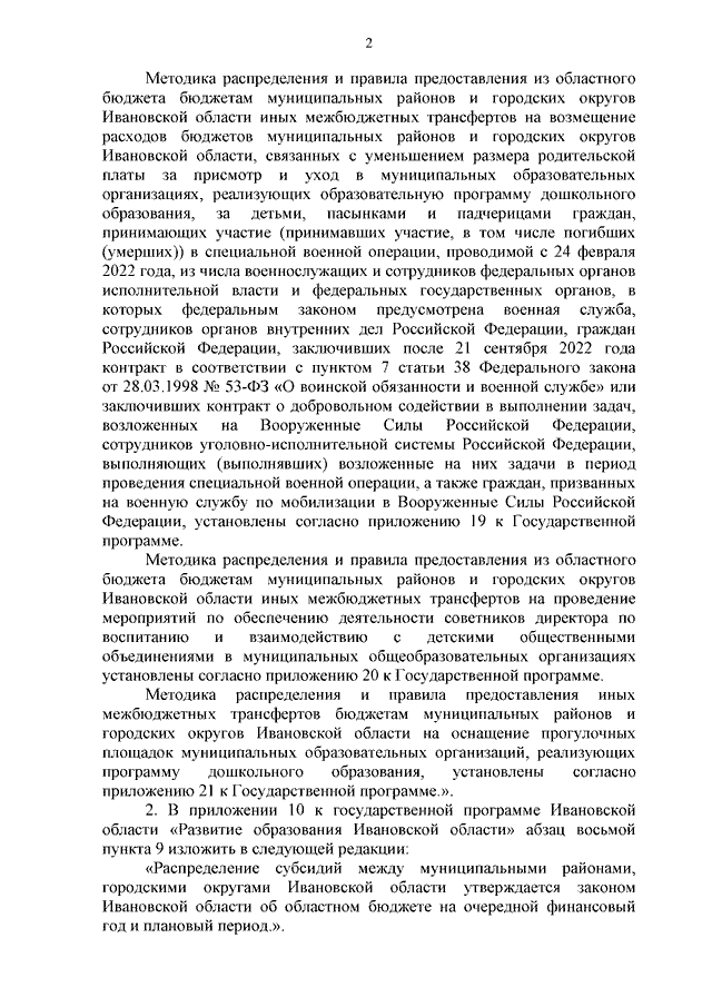 Постановление Правительства Ивановской области от 04.12.2023 N 584-п "О внесении изменений в постановление Правительства Ивановской области от 13.11.2013 N 450-п "Об утверждении государственной программы Ивановской области "Развитие образования Ивановской области" (вместе с "Методикой распределения и правилами предоставления из областного бюджета бюджетам муниципальных районов и городских округов Ивановской области иных межбюджетных трансфертов на ежемесячное денежное вознаграждение за классное руководство педагогическим работникам муниципальных образовательных организаций, реализующих образовательные программы начального общего образования, образовательные программы основного общего образования, образовательные программы среднего общего образования", "Методикой распределения и правилами предоставления из областного бюджета бюджетам муниципальных районов и городских округов Ивановской области иных межбюджетных трансфертов на возмещение расходов бюджетов муниципальных районов и городских округов Ивановской области, связанных с уменьшением размера родительской платы за присмотр и уход в муниципальных образовательных организациях, реализующих образовательную программу дошкольного образования, за детьми, пасынками и падчерицами граждан, принимающих участие (принимавших участие, в том числе погибших (умерших)) в специальной военной операции, проводимой с 24 февраля 2022 года, из числа военнослужащих и сотрудников федеральных органов исполнительной власти и федеральных государственных органов, в которых федеральным законом предусмотрена военная служба, сотрудников органов внутренних дел Российской Федерации, граждан Российской Федерации, заключивших после 21 сентября 2022 года контракт в соответствии с пунктом 7 статьи 38 Федерального закона от 28.03.1998 N 53-ФЗ "О воинской обязанности и военной службе" или заключивших контракт о добровольном содействии в выполнении задач, возложенных на Вооруженные Силы Российской Федерации, сотрудников уголовно-исполнительной системы Российской Федерации, выполняющих (выполнявших) возложенные на них задачи в период проведения специальной военной операции, а также граждан, призванных на военную службу по мобилизации в Вооруженные Силы Российской Федерации", "Методикой распределения и правилами предоставления из областного бюджета бюджетам муниципальных районов и городских округов Ивановской области иных межбюджетных трансфертов на проведение мероприятий по обеспечению деятельности советников директора по воспитанию и взаимодействию с детскими общественными объединениями в муниципальных общеобразовательных организациях", "Методикой распределения и правилами предоставления иных межбюджетных трансфертов бюджетам муниципальных районов и городских округов Ивановской области на оснащение прогулочных площадок муниципальных образовательных организаций, реализующих программу дошкольного образования")