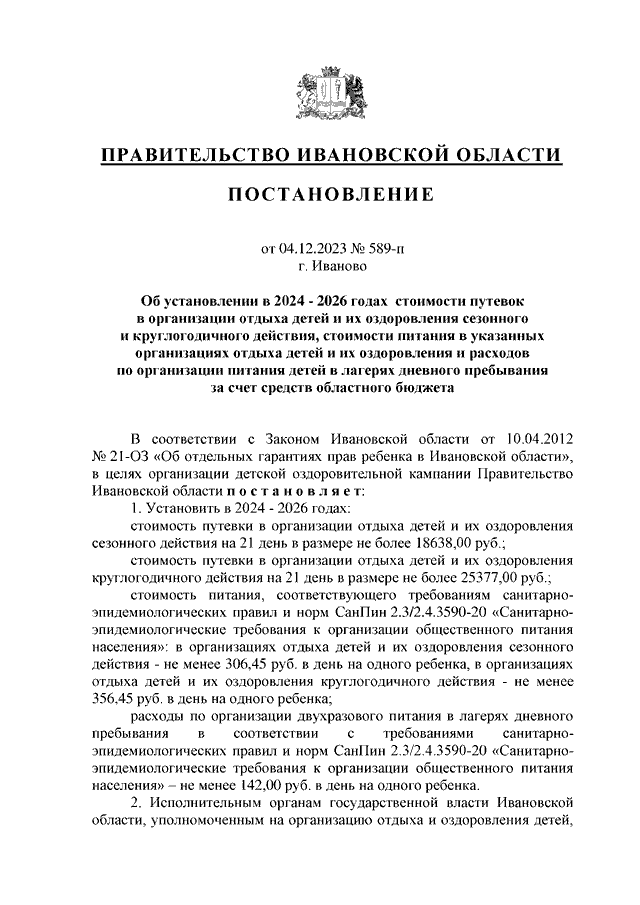 Постановление Правительства Ивановской области от 04.12.2023 N 589-п "Об установлении в 2024 - 2026 годах стоимости путевок в организации отдыха детей и их оздоровления сезонного и круглогодичного действия, стоимости питания в указанных организациях отдыха детей и их оздоровления и расходов по организации питания детей в лагерях дневного пребывания за счет средств областного бюджета"
