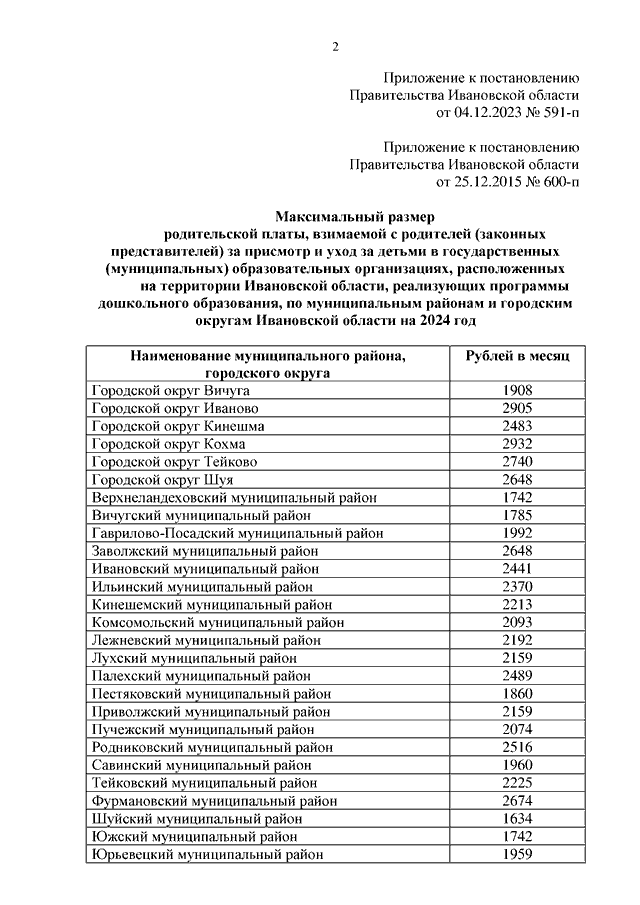 Постановление Правительства Ивановской области от 04.12.2023 N 591-п "О внесении изменений в постановление Правительства Ивановской области от 25.12.2015 N 600-п "О максимальном размере родительской платы, взимаемой с родителей (законных представителей) за присмотр и уход за детьми в государственных (муниципальных) образовательных организациях, расположенных на территории Ивановской области, реализующих программы дошкольного образования, по муниципальным районам и городским округам Ивановской области"