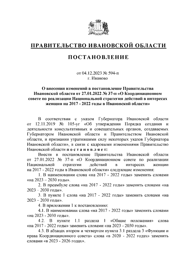 Постановление Правительства Ивановской области от 04.12.2023 N 594-п "О внесении изменений в постановление Правительства Ивановской области от 27.01.2022 N 37-п "О Координационном совете по реализации Национальной стратегии действий в интересах женщин на 2017 - 2022 годы в Ивановской области"