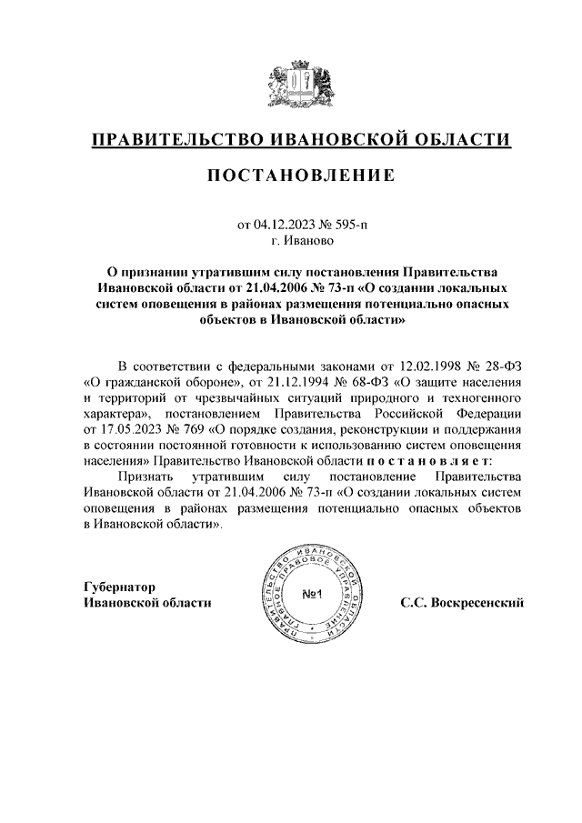 Постановление Правительства Ивановской области от 04.12.2023 N 595-п "О признании утратившим силу постановления Правительства Ивановской области от 21.04.2006 N 73-п "О создании локальных систем оповещения в районах размещения потенциально опасных объектов в Ивановской области"