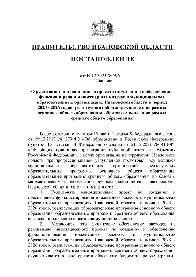 Постановление Правительства Ивановской области от 04.12.2023 N 596-п "О реализации инновационного проекта по созданию и обеспечению функционирования инженерных классов в муниципальных образовательных организациях Ивановской области в период 2023 - 2026 годов, реализующих образовательные программы основного общего образования, образовательные программы среднего общего образования" (вместе с "Перечнем муниципальных образовательных организаций Ивановской области, реализующих образовательные программы основного общего образования, образовательные программы среднего общего образования, на базе которых функционируют инженерные классы в период 2023 - 2026 годов")