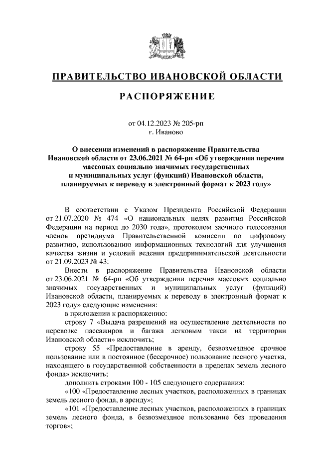Распоряжение Правительства Ивановской области от 04.12.2023 N 205-рп "О внесении изменений в распоряжение Правительства Ивановской области от 23.06.2021 N 64-рп "Об утверждении перечня массовых социально значимых государственных и муниципальных услуг (функций) Ивановской области, планируемых к переводу в электронный формат к 2023 году"