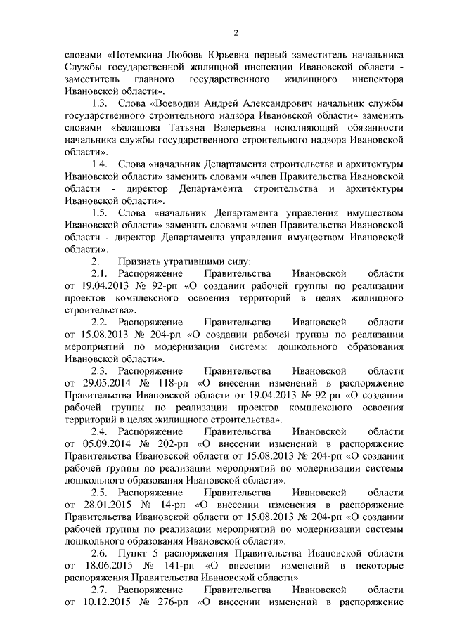 Распоряжение Правительства Ивановской области от 04.12.2023 N 206-рп "О внесении изменений в распоряжение Правительства Ивановской области от 23.08.2006 N 192-рп "О составе межведомственной комиссии по признанию помещения жилым помещением, жилого помещения пригодным (непригодным) для проживания граждан и многоквартирного дома аварийным и подлежащим сносу или реконструкции" и признании утратившими силу некоторых распоряжений Правительства Ивановской области"