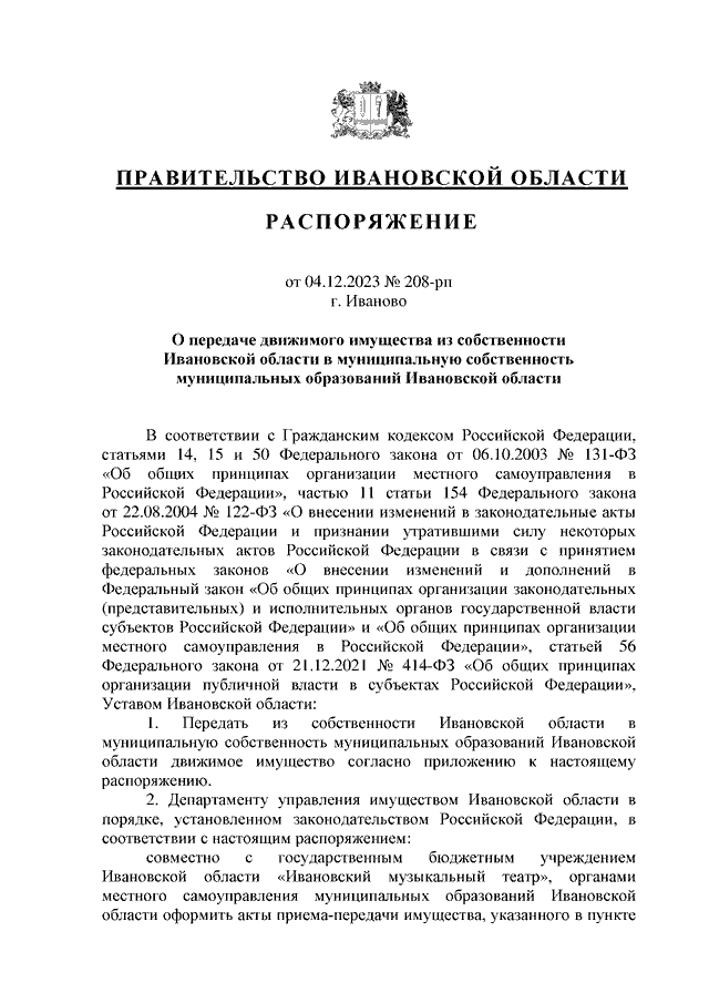 Распоряжение Правительства Ивановской области от 04.12.2023 N 208-рп "О передаче движимого имущества из собственности Ивановской области в муниципальную собственность муниципальных образований Ивановской области"