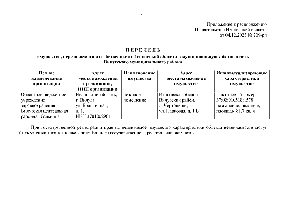 Распоряжение Правительства Ивановской области от 04.12.2023 N 209-рп "О передаче имущества из собственности Ивановской области в муниципальную собственность Вичугского муниципального района"
