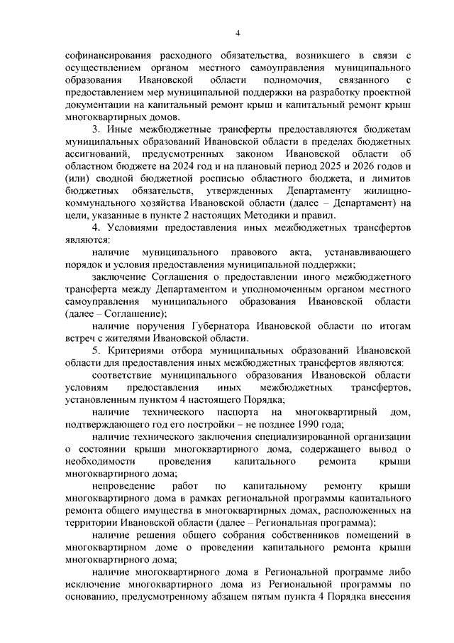 Постановление Правительства Ивановской области от 07.12.2023 N 603-п "Об утверждении Методики распределения и правил предоставления из областного бюджета иных межбюджетных трансфертов бюджетам муниципальных образований Ивановской области в целях софинансирования расходного обязательства, возникшего в связи с осуществлением органом местного самоуправления муниципального образования Ивановской области полномочия, связанного с предоставлением мер финансовой поддержки товариществам собственников жилья, жилищным, жилищно-строительным кооперативам, созданным в соответствии с Жилищным кодексом Российской Федерации, юридическим лицам независимо от организационно-правовой формы или индивидуальным предпринимателям, осуществляющим предпринимательскую деятельность по управлению многоквартирными домами на основании лицензии, специализированным некоммерческим организациям, которые осуществляют деятельность, направленную на обеспечение проведения капитального ремонта общего имущества в многоквартирных домах, для обеспечения своевременного проведения капитального ремонта общего имущества в многоквартирных домах в 2024 году"