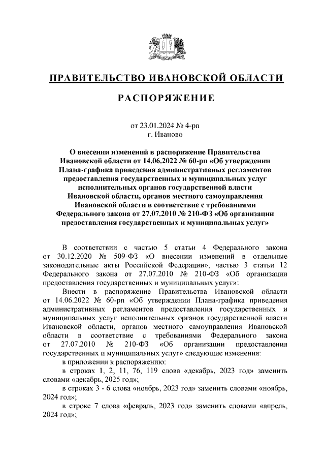 Распоряжение Правительства Ивановской области от 23.01.2024 N 4-рп "О внесении изменений в распоряжение Правительства Ивановской области от 14.06.2022 N 60-рп "Об утверждении Плана-графика приведения административных регламентов предоставления государственных и муниципальных услуг исполнительных органов государственной власти Ивановской области, органов местного самоуправления Ивановской области в соответствие с требованиями Федерального закона от 27.07.2010 N 210-ФЗ "Об организации предоставления государственных и муниципальных услуг"