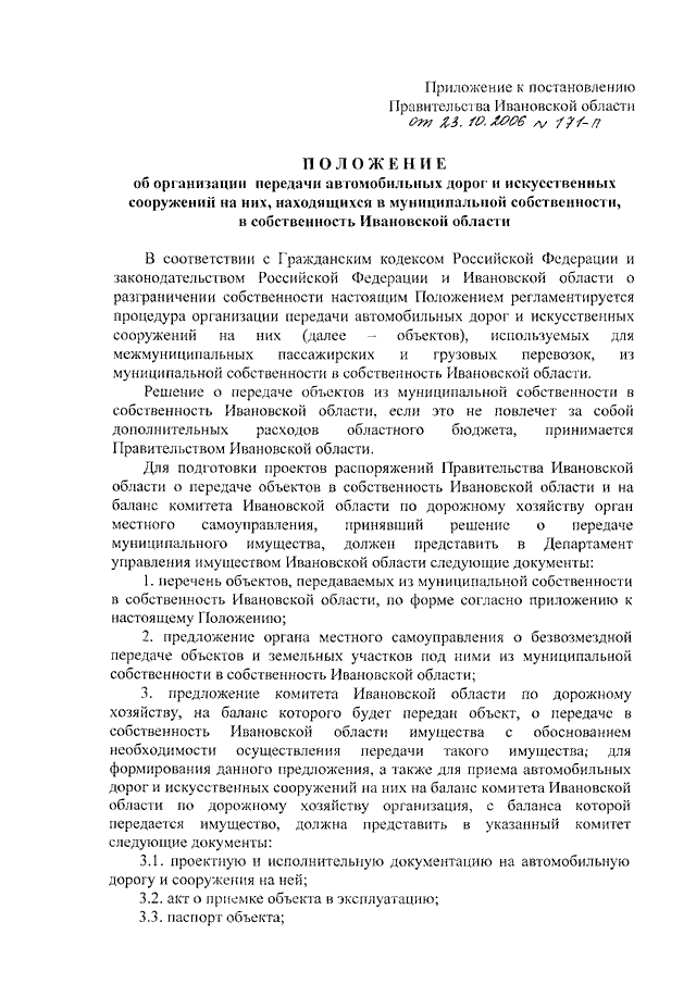 Постановление Правительства Ивановской области от 23.10.2006 N 171-п "Об организации передачи автомобильных дорог и искусственных сооружений на них, находящихся в муниципальной собственности, в собственность Ивановской области" (вместе с "Положением об организации передачи автомобильных дорог и искусственных сооружений на них, находящихся в муниципальной собственности, в собственность Ивановской области")