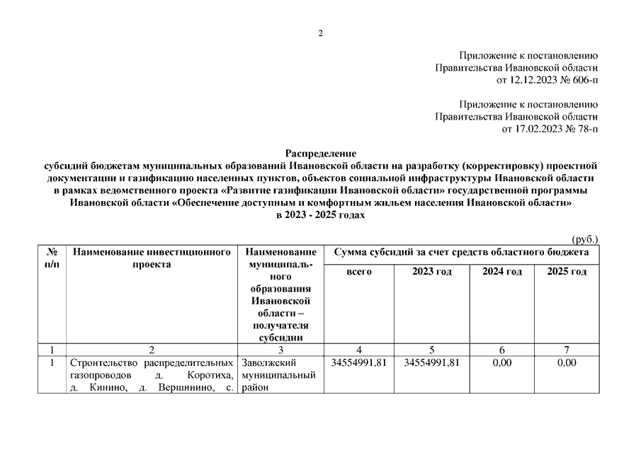 Постановление Правительства Ивановской области от 12.12.2023 N 606-п "О внесении изменения в постановление Правительства Ивановской области от 17.02.2023 N 78-п "О распределении субсидий бюджетам муниципальных образований Ивановской области на разработку (корректировку) проектной документации и газификацию населенных пунктов, объектов социальной инфраструктуры Ивановской области в рамках ведомственного проекта "Развитие газификации Ивановской области" государственной программы Ивановской области "Обеспечение доступным и комфортным жильем населения Ивановской области" в 2023 - 2025 годах"