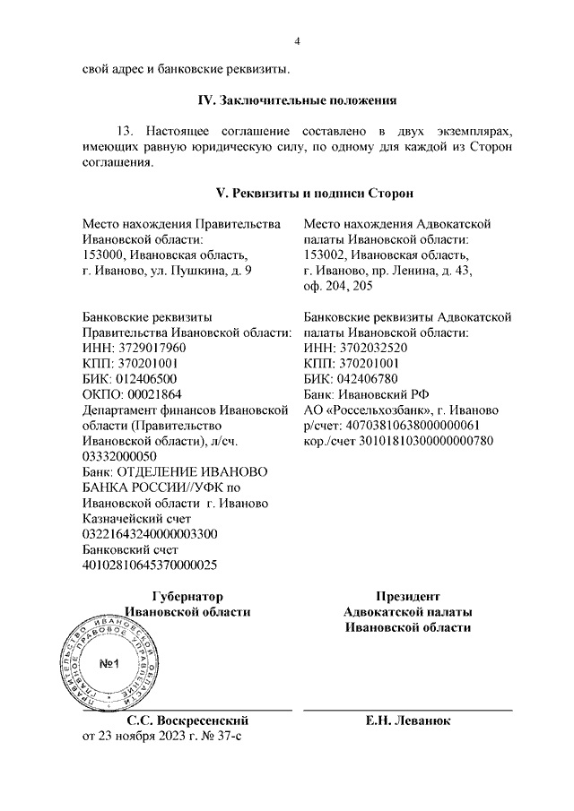 "Соглашение об оказании бесплатной юридической помощи адвокатами, являющимися участниками государственной системы бесплатной юридической помощи" (Заключено в г. Иваново 23.11.2023 N 37-с) (вместе со "Списком адвокатов Ивановской области, участвующих в деятельности государственной системы бесплатной юридической помощи")
