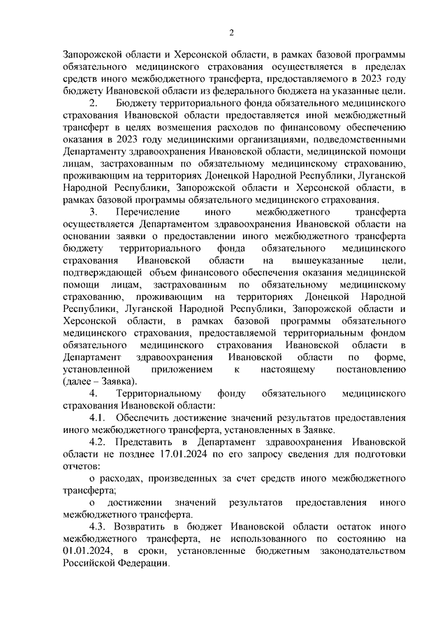 Постановление Правительства Ивановской области от 14.12.2023 N 612-п "О возмещении расходов по финансовому обеспечению оказания медицинской помощи лицам, застрахованным по обязательному медицинскому страхованию, проживающим на территориях Донецкой Народной Республики, Луганской Народной Республики, Запорожской области и Херсонской области, в рамках базовой программы обязательного медицинского страхования"