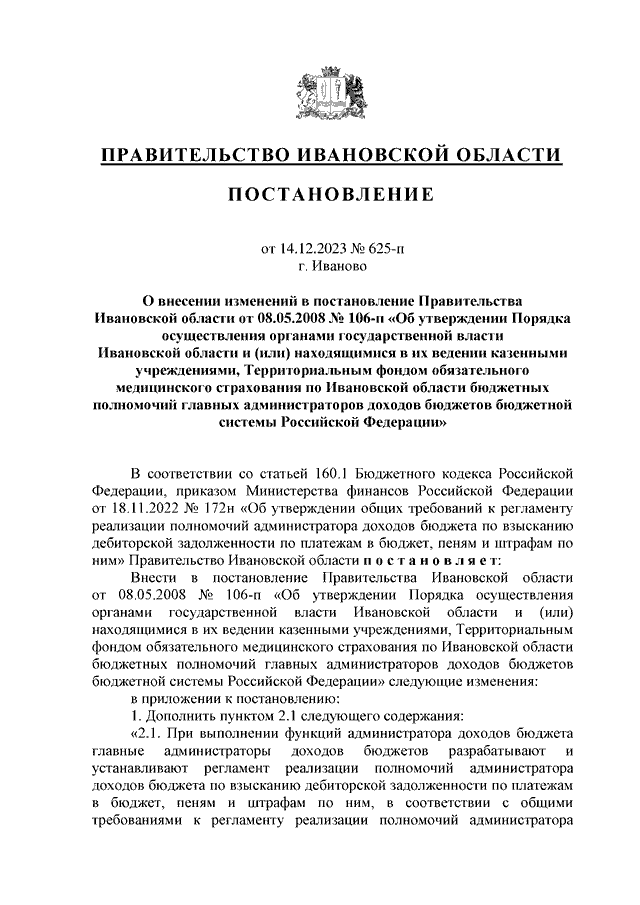 Постановление Правительства Ивановской области от 14.12.2023 N 625-п "О внесении изменений в постановление Правительства Ивановской области от 08.05.2008 N 106-п "Об утверждении Порядка осуществления органами государственной власти Ивановской области и (или) находящимися в их ведении казенными учреждениями, Территориальным фондом обязательного медицинского страхования по Ивановской области бюджетных полномочий главных администраторов доходов бюджетов бюджетной системы Российской Федерации"