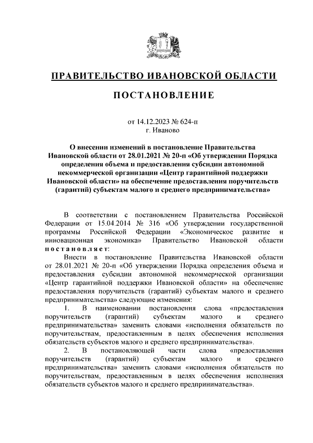 Постановление Правительства Ивановской области от 14.12.2023 N 624-п "О внесении изменений в постановление Правительства Ивановской области от 28.01.2021 N 20-п "Об утверждении Порядка определения объема и предоставления субсидии автономной некоммерческой организации "Центр гарантийной поддержки Ивановской области" на обеспечение предоставления поручительств (гарантий) субъектам малого и среднего предпринимательства"