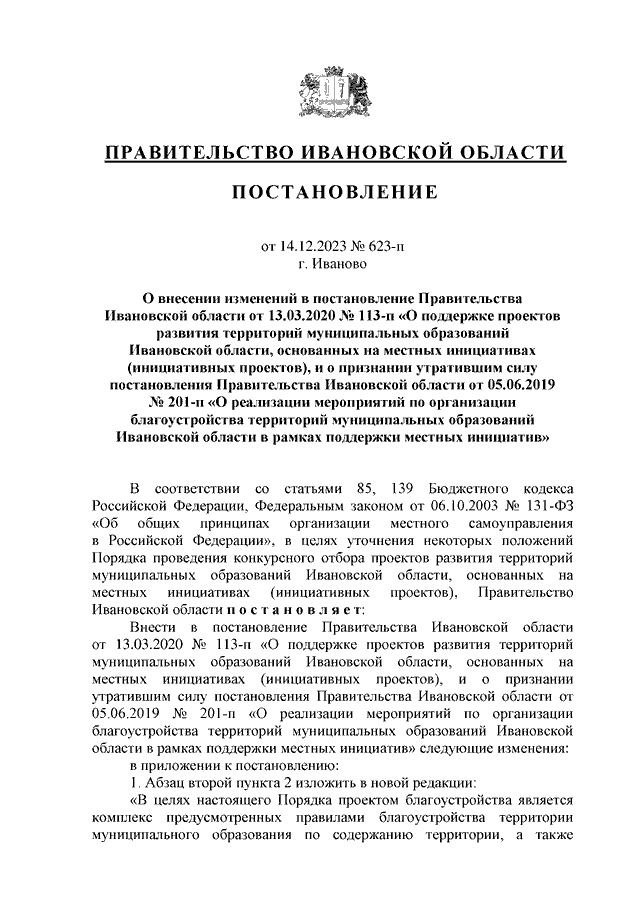 Постановление Правительства Ивановской области от 14.12.2023 N 623-п "О внесении изменений в постановление Правительства Ивановской области от 13.03.2020 N 113-п "О поддержке проектов развития территорий муниципальных образований Ивановской области, основанных на местных инициативах (инициативных проектов), и о признании утратившим силу постановления Правительства Ивановской области от 05.06.2019 N 201-п "О реализации мероприятий по организации благоустройства территорий муниципальных образований Ивановской области в рамках поддержки местных инициатив"