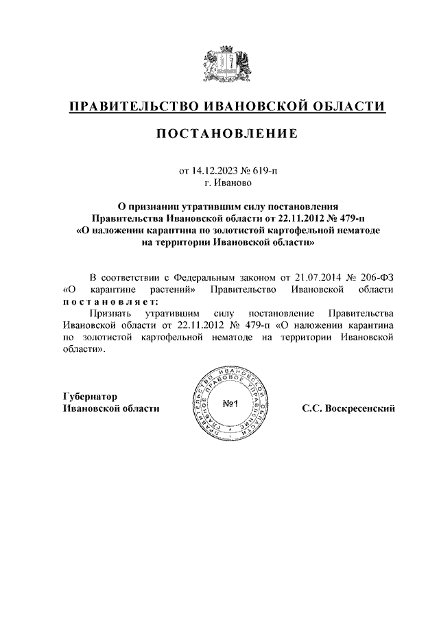 Постановление Правительства Ивановской области от 14.12.2023 N 619-п "О признании утратившим силу постановления Правительства Ивановской области от 22.11.2012 N 479-п "О наложении карантина по золотистой картофельной нематоде на территории Ивановской области"