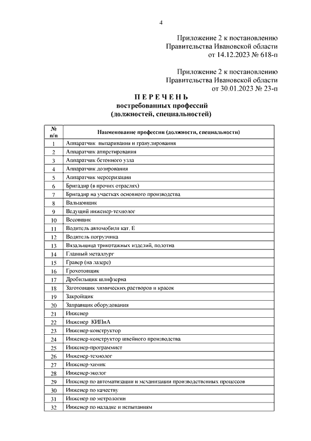 Постановление Правительства Ивановской области от 14.12.2023 N 618-п "О внесении изменений в постановление Правительства Ивановской области от 30.01.2023 N 23-п "Об утверждении перечня организаций, испытывающих потребность в привлечении работников, и перечня востребованных профессий (должностей, специальностей)"