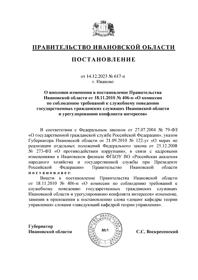 Постановление Правительства Ивановской области от 14.12.2023 N 617-п "О внесении изменения в постановление Правительства Ивановской области от 18.11.2010 N 406-п "О комиссии по соблюдению требований к служебному поведению государственных гражданских служащих Ивановской области и урегулированию конфликта интересов"