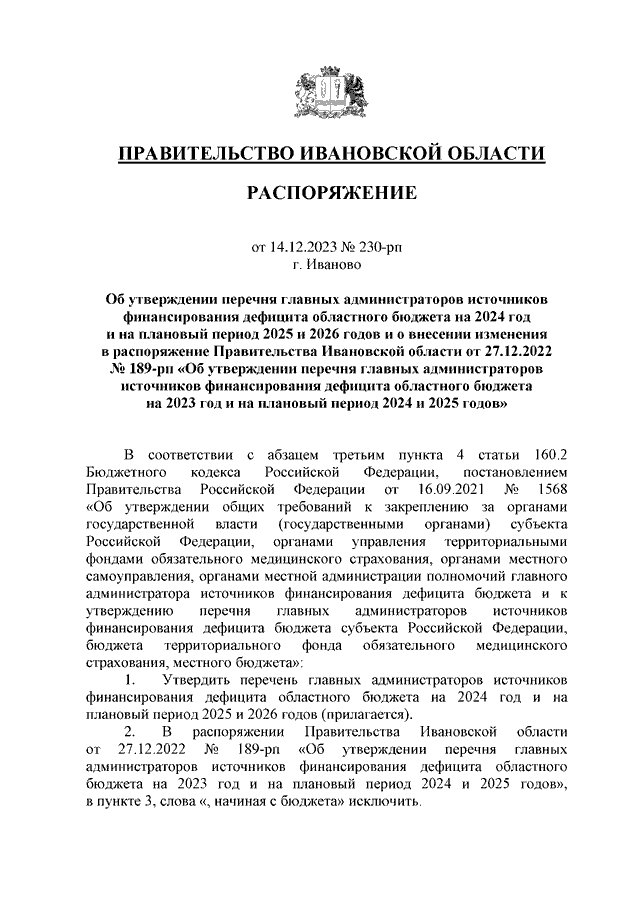 Распоряжение Правительства Ивановской области от 14.12.2023 N 230-рп "Об утверждении перечня главных администраторов источников финансирования дефицита областного бюджета на 2024 год и на плановый период 2025 и 2026 годов и о внесении изменения в распоряжение Правительства Ивановской области от 27.12.2022 N 189-рп "Об утверждении перечня главных администраторов источников финансирования дефицита областного бюджета на 2023 год и на плановый период 2024 и 2025 годов"
