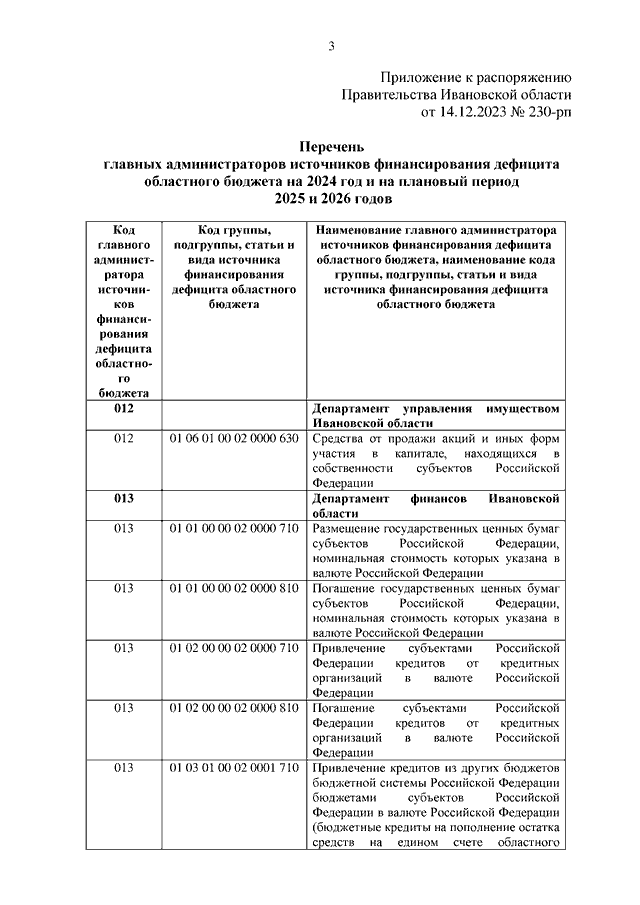 Распоряжение Правительства Ивановской области от 14.12.2023 N 230-рп "Об утверждении перечня главных администраторов источников финансирования дефицита областного бюджета на 2024 год и на плановый период 2025 и 2026 годов и о внесении изменения в распоряжение Правительства Ивановской области от 27.12.2022 N 189-рп "Об утверждении перечня главных администраторов источников финансирования дефицита областного бюджета на 2023 год и на плановый период 2024 и 2025 годов"