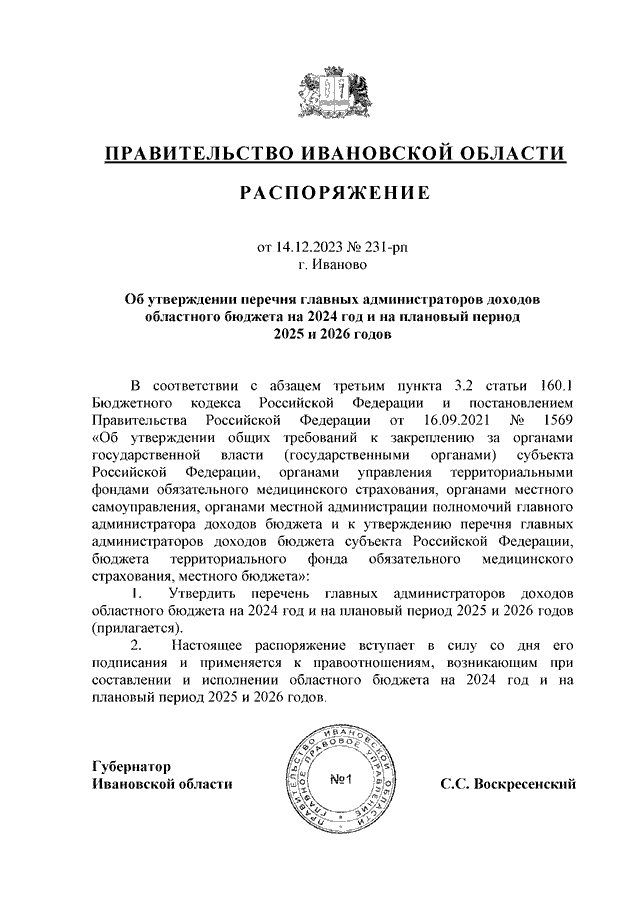 Распоряжение Правительства Ивановской области от 14.12.2023 N 231-рп "Об утверждении перечня главных администраторов доходов областного бюджета на 2024 год и на плановый период 2025 и 2026 годов"
