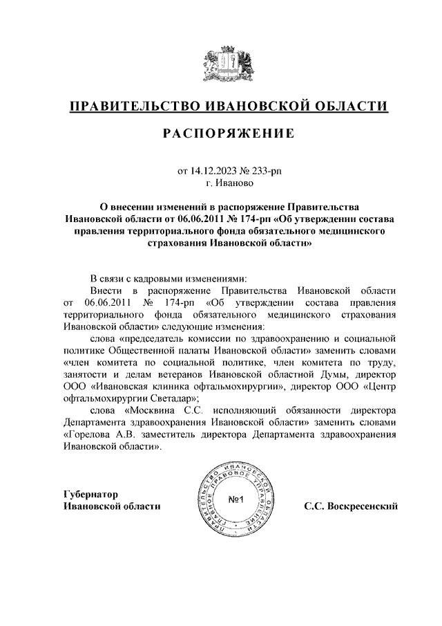 Распоряжение Правительства Ивановской области от 14.12.2023 N 233-рп "О внесении изменений в распоряжение Правительства Ивановской области от 06.06.2011 N 174-рп "Об утверждении состава правления территориального фонда обязательного медицинского страхования Ивановской области"