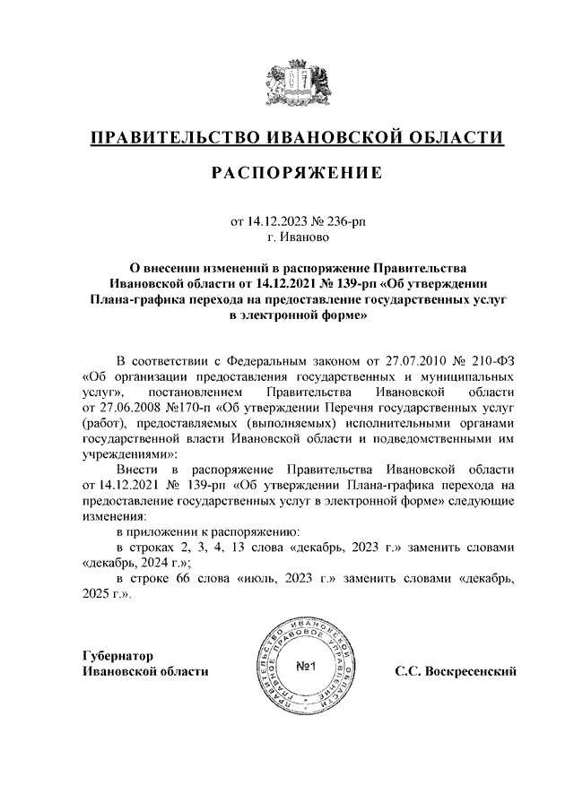Распоряжение Правительства Ивановской области от 14.12.2023 N 236-рп "О внесении изменений в распоряжение Правительства Ивановской области от 14.12.2021 N 139-рп "Об утверждении Плана-графика перехода на предоставление государственных услуг в электронной форме"