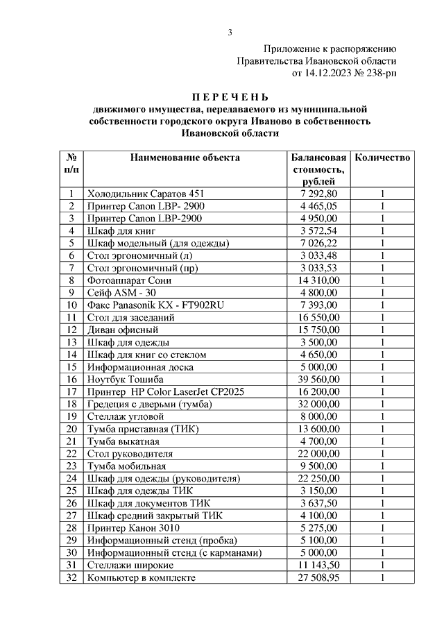Распоряжение Правительства Ивановской области от 14.12.2023 N 238-рп "О передаче из муниципальной собственности городского округа Иваново в собственность Ивановской области движимого имущества"