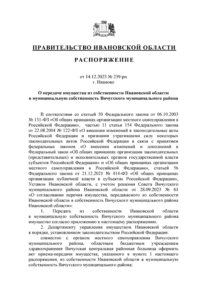 Распоряжение Правительства Ивановской области от 14.12.2023 N 239-рп "О передаче имущества из собственности Ивановской области в муниципальную собственность Вичугского муниципального района"