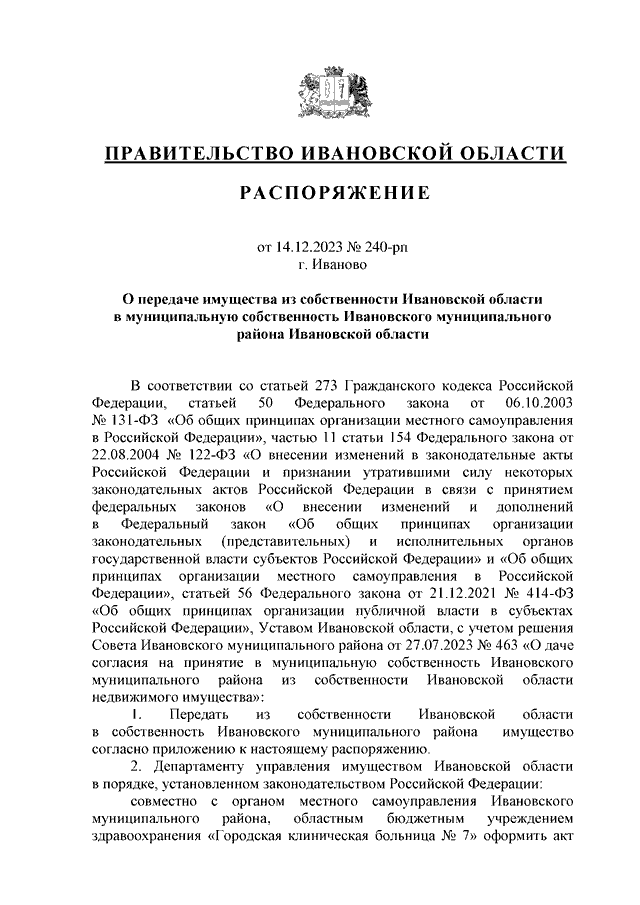 Распоряжение Правительства Ивановской области от 14.12.2023 N 240-рп "О передаче имущества из собственности Ивановской области в муниципальную собственность Ивановского муниципального района Ивановской области"