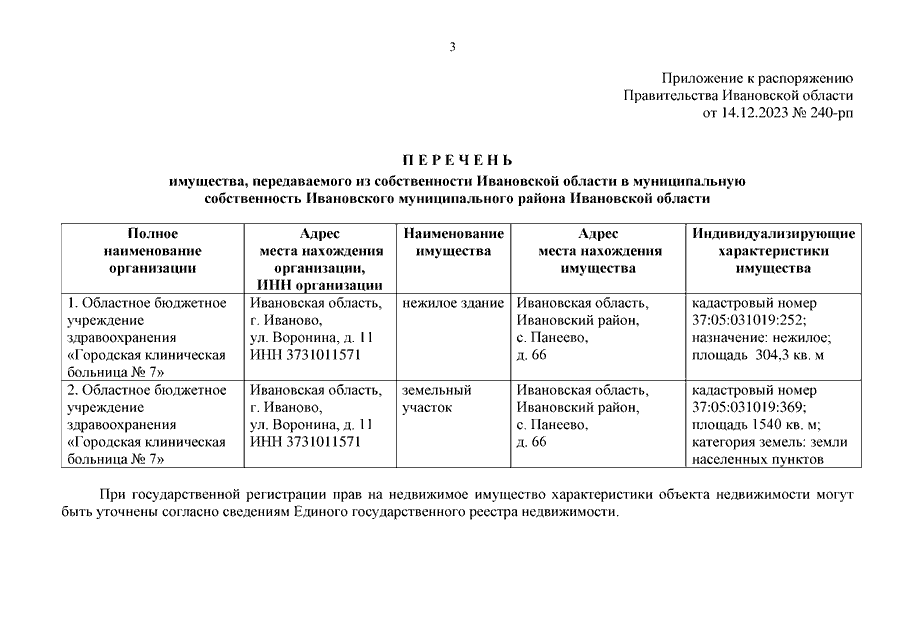 Распоряжение Правительства Ивановской области от 14.12.2023 N 240-рп "О передаче имущества из собственности Ивановской области в муниципальную собственность Ивановского муниципального района Ивановской области"