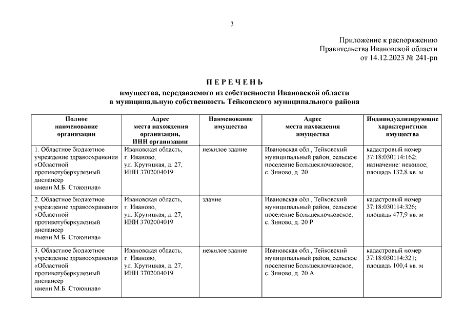 Распоряжение Правительства Ивановской области от 14.12.2023 N 241-рп "О передаче имущества из собственности Ивановской области в муниципальную собственность Тейковского муниципального района"