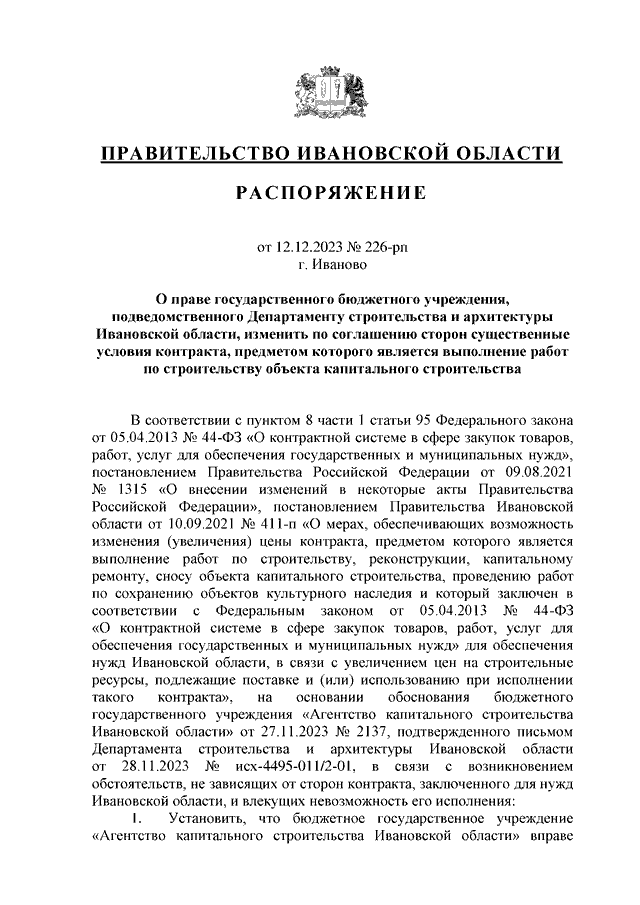Распоряжение Правительства Ивановской области от 12.12.2023 N 226-рп "О праве государственного бюджетного учреждения, подведомственного Департаменту строительства и архитектуры Ивановской области, изменить по соглашению сторон существенные условия контракта, предметом которого является выполнение работ по строительству объекта капитального строительства"